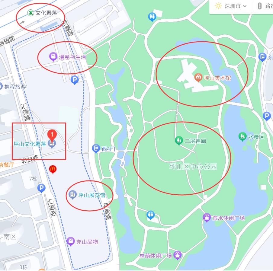 白天可在坪山文化聚落看书/观展/观看节目等,晚上走到对面坪山中心公园感受清新自然!