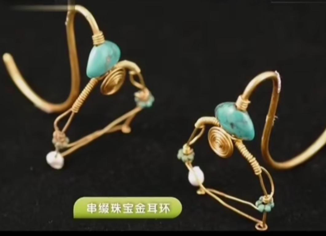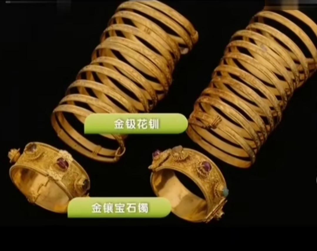 梁庄王的棺床上金光闪闪,金质的容器、金锭、饰物林林总总。其中有几件别致的金镶宝石器物引起了大家的注意。