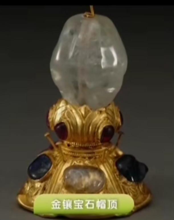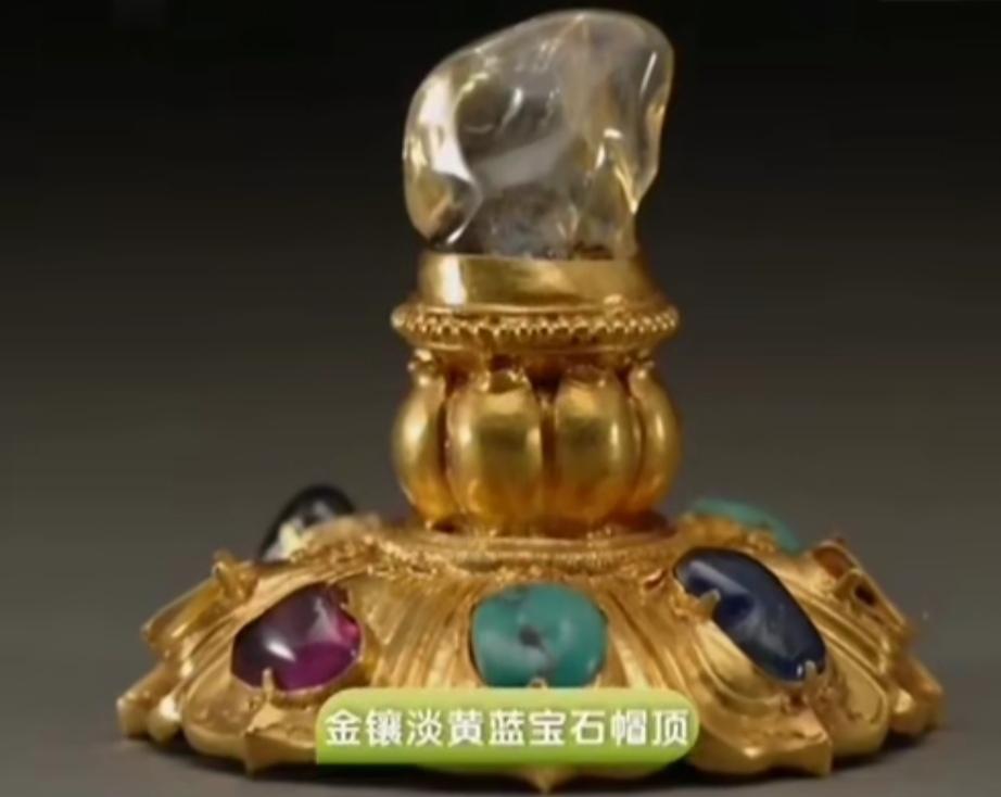 梁庄王墓出土了六个帽顶:金镶宝石帽顶、金镶蓝宝石帽顶、金镶淡黄蓝宝石帽顶、镶宝金冠顶、金镶宝石白玉镂空龙穿牡丹帽顶、金花丝镶宝石帽顶。它们是元代大盖帽的帽顶,帽顶有金的、银的、宝石的,元代帝王很看重这些东西。元代被明代替代后,汉族人不用大盖帽,所以就用它们做了古董盖上的钮。帽顶有完整的金座,这个金器反映了元代的工艺水平。
