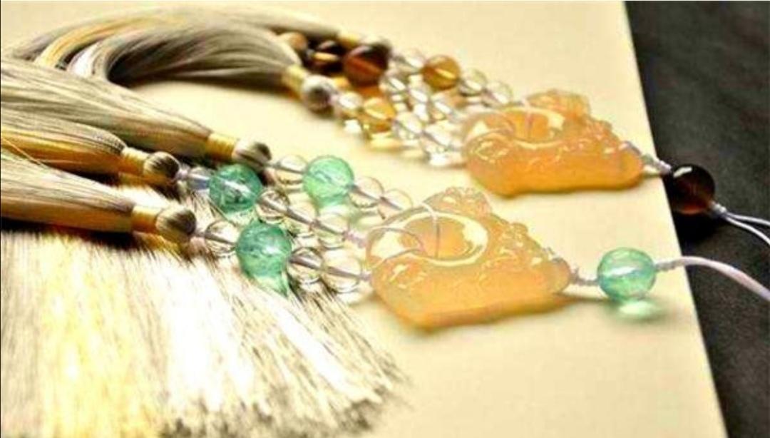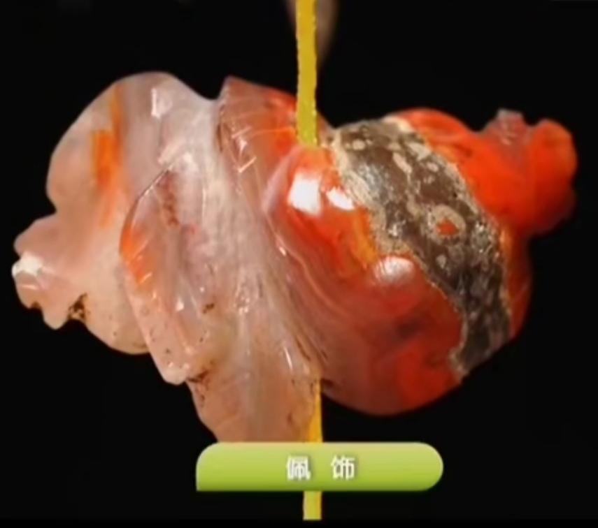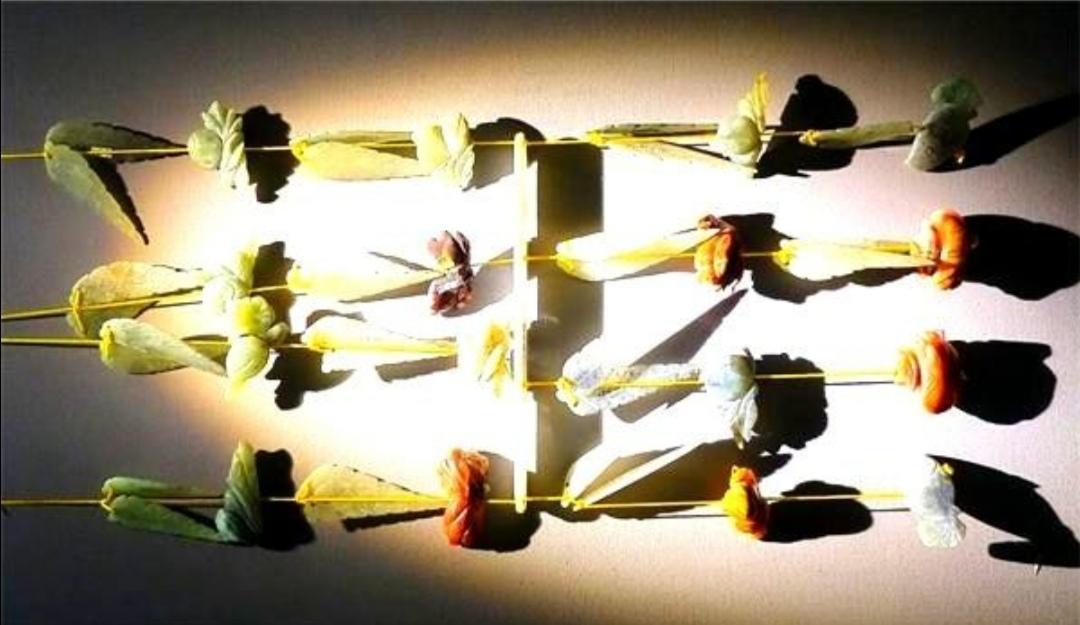 在梁庄王墓中出还土了一套叫“玉叶组佩”的皇家珍宝。经专家修复后的玉叶组佩长59厘米,由49件玉饰组成,它不但精致而华贵,而且将众多有吉祥寓意的饰物归为一体,象征大吉大利:其中包括32片玉叶,代表金枝玉叶;这是4只玉桃,桃子象征长寿,也有逃灾保平安之意,四只玉桃寓意福寿平安;这是4件玉瓜,象征瓜熟蒂落;这是两条玉鱼,象征富贵有馀;此外,玉叶组佩上还有玛瑙制成的石榴4个,象征多子多福;两只玛瑙鸳鸯,寓意百年和美。每件小的饰品上都有一个穿孔,再以黄丝线串联而成,整件玉佩可谓美不胜收。