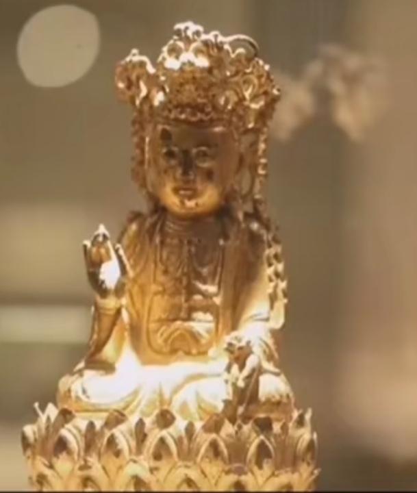 在梁庄王的金器收藏品中,还有一些造型奇特的物件,它们也都是在棺床上被发现的,经过仔细观察,这些器物竟然属于宗教法器。法器种类就是像、字、文、坛之类。“像”就是塑像,“字”就是种子字,“文”就是咒语之类,“珠”就是项链,分为几大类。