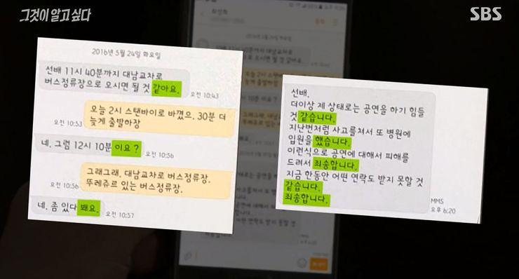 接着,两天之后,也就是5月30号的时候,妻子又给剧团前辈发短信说:“前辈,我目前的状态无法演出。和上一次一样又出了事故住院了,这样突然无法演出,很抱歉,现在不方便接受任何联系,对不起”。