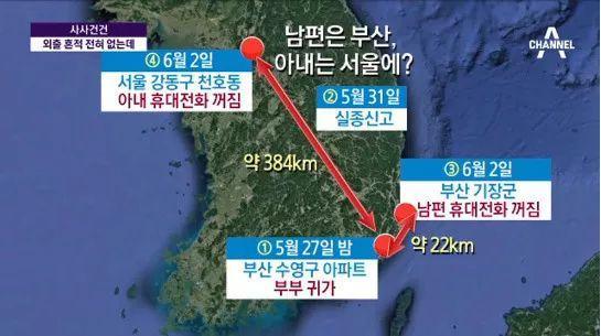 之后,丈夫全某的手机在6月2号早上8点48分的时候,在釜山关机了。而离奇的是,妻子崔某的手机是在同一天到晚上9:45在首尔江东区关机了。