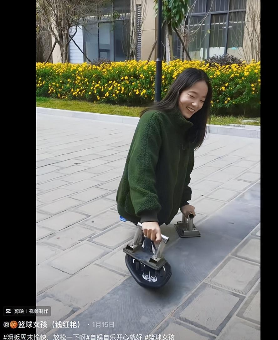 视频中的钱红艳学会了滑滑板,从前的两个木手垫也换成了铁质手垫。