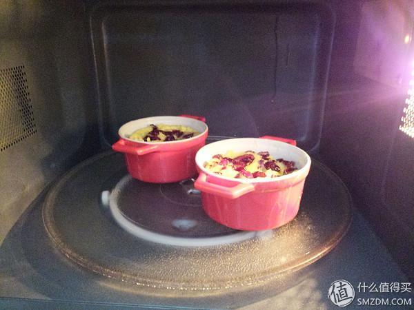 ▼如果用烤箱,烤盘内放1-2cm水,将焗碗放入烤盘,烤盘预热到170度,烤35分钟,至表面金黄。我是用的微波炉,微波炉一般的小焗碗,5-10分钟,中途仔细观察,焗碗底部放入少量蛋液,不宜过多,容易溢出。
