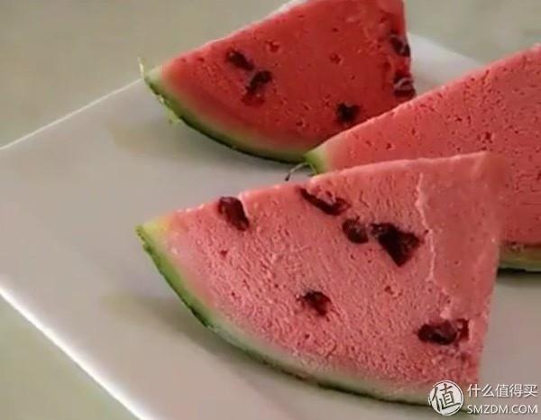 ▼西瓜混合汁晾凉和淡奶油混合,每冷冻一小时打发一次,连续打发三次,最后一次加入蔓越莓干,放入挖空的西瓜里,然后冻3小时,就成功了,理论上是下面的样子。