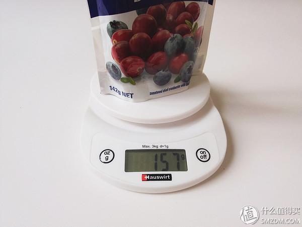 ▼蓝莓味蔓越莓干重量。标重142g,带包装157g,基本符合。