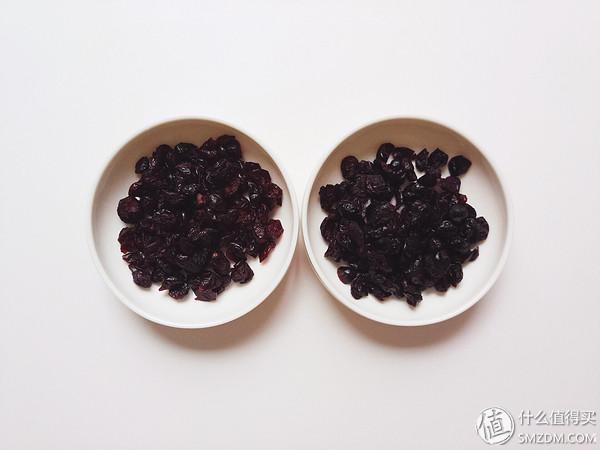 ▼图左为原味蔓越莓干,图右为蓝莓味蔓越莓干。原味的颜色较浅,蓝莓味的略深;原味的口感较软,蓝莓味的硬一点;原味的湿一点,蓝莓味的干一点,不过差距不大;原味的更酸一点,蓝莓味的略微甜一点。
