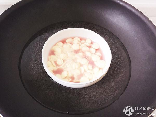▼巧克力币和蔓越莓果汁混合隔水融化,巧克力币也融化的超级快,我差点都没有拍上照