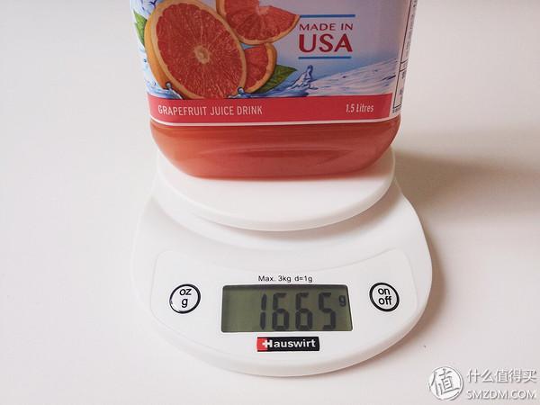 ▼宝石红西柚果汁重量。标1.5L,密度比水大,加上瓶子1665g,基本应该差不多。比上面的蔓越莓重,可能密度比较大的缘故。