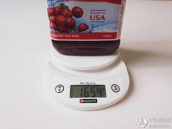 ▼经典蔓越莓果汁重量。标1.5L,密度比水大,加上瓶子1654g,基本应该差不多。