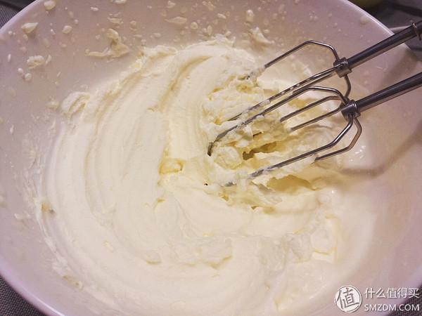 ▼淡奶油打发七成备用,这个淡奶油超级好打发,也就两分钟就是下面这个程度了,其实应该少打一会儿,比这个稀一点。另外打发的机器竖直打发比较不容易溅的到处都是。