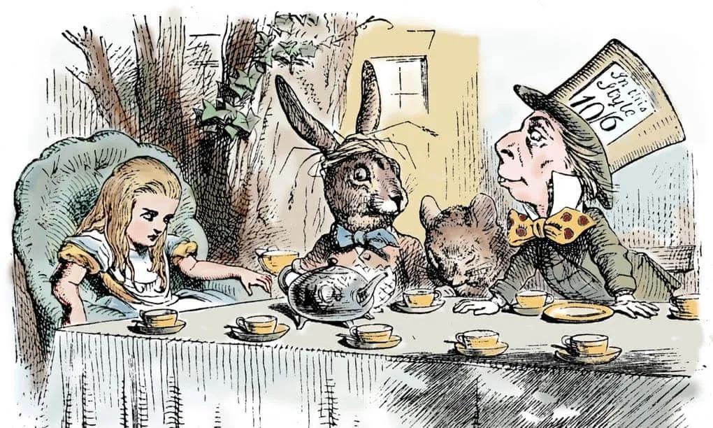 是在1865年出版的《爱丽丝梦游仙境》小说第七章中茶会情节,在那场不可思议的下午茶会上,疯帽匠(Mad Hatter)睡鼠、兔子一起喝茶时疯帽子说的一句话,茶会上,疯帽子问道:“为什么乌鸦像写字台?