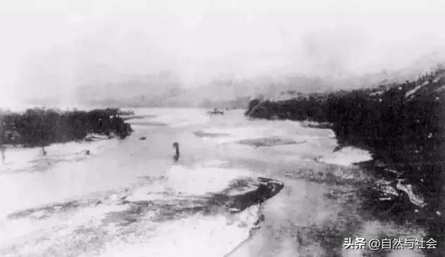 1933年10月叠溪地震溃水冲毁了的都江堰渠首枢纽工程(其中突出物为神仙墩)
