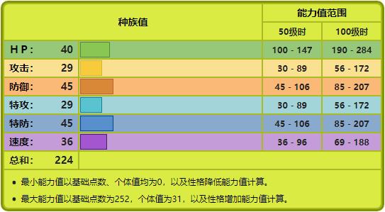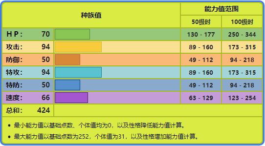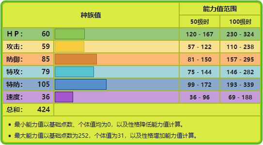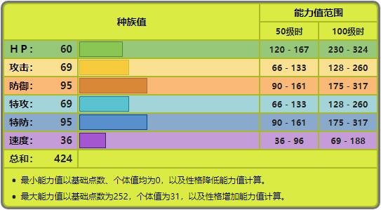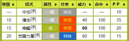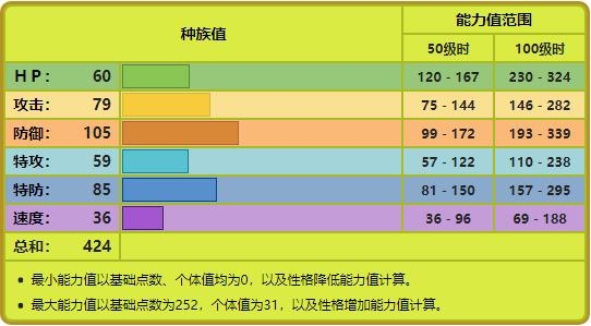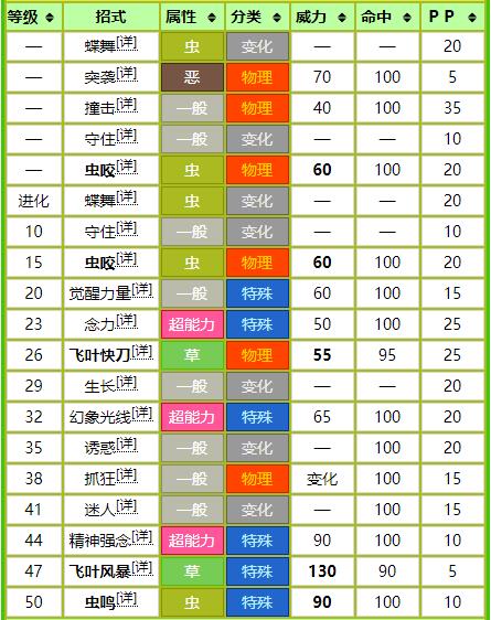 注:技能参照第七世代游戏技能表。技能里粗体字的招式为具有属性一致加成效果的招式。招式教学是可以通过招式教学习得。PP则是使用技能次数。