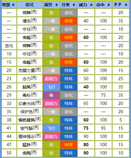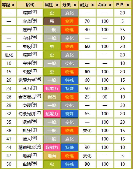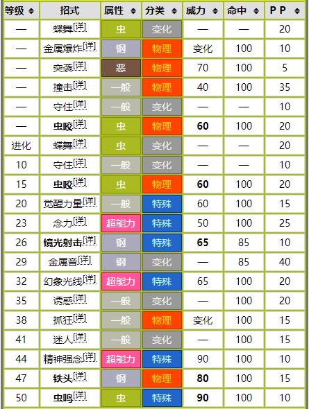 虫之预感特性:HP减少的时候,虫属性的招式威力会提高。在游戏对战中,当HP不超过1⁄3时,虫属性招式的威力增长为1.5倍。