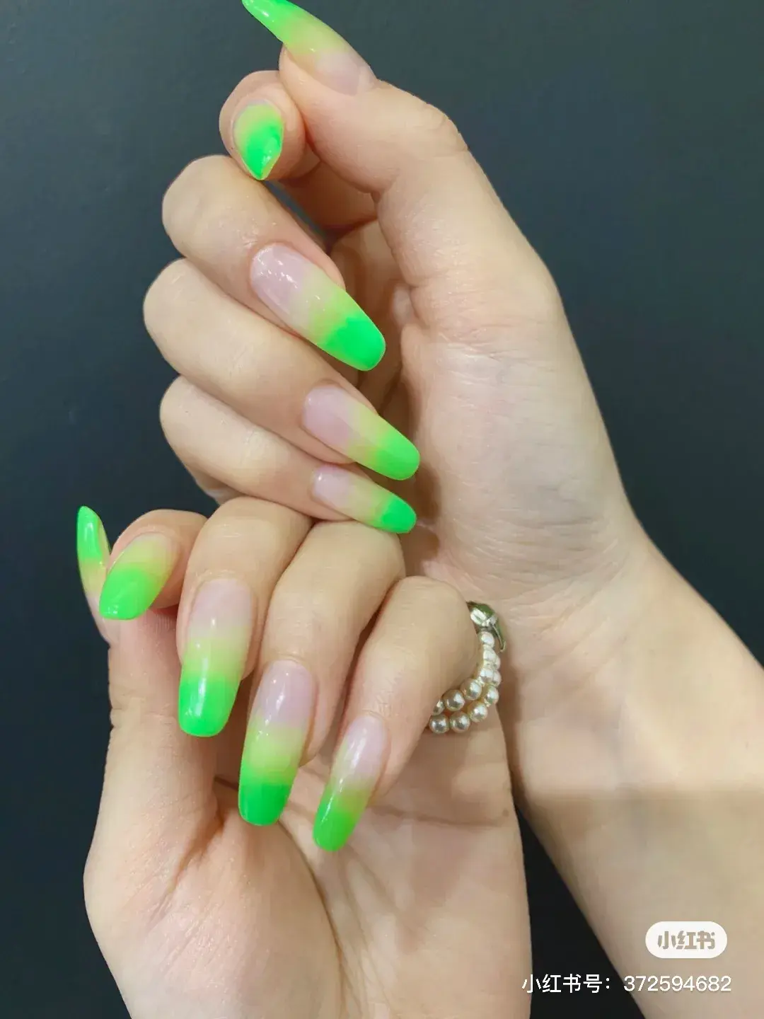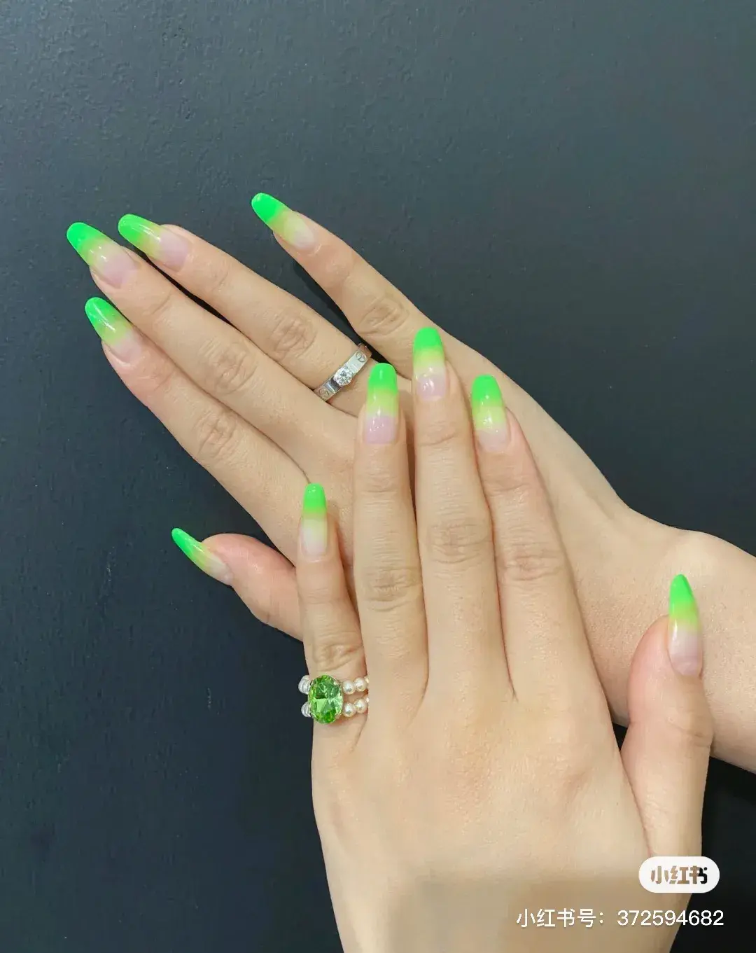 THE-9的安崎绝对是炫酷风美甲的忠实粉丝,这款荧光绿渐变甲片款美甲可是她的挚爱,再配上同色系的戒指,当之无愧人群中最亮眼的指甲~