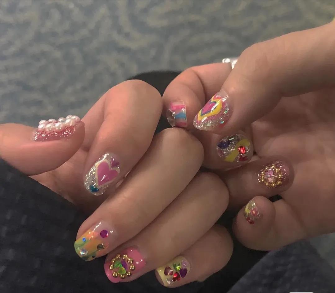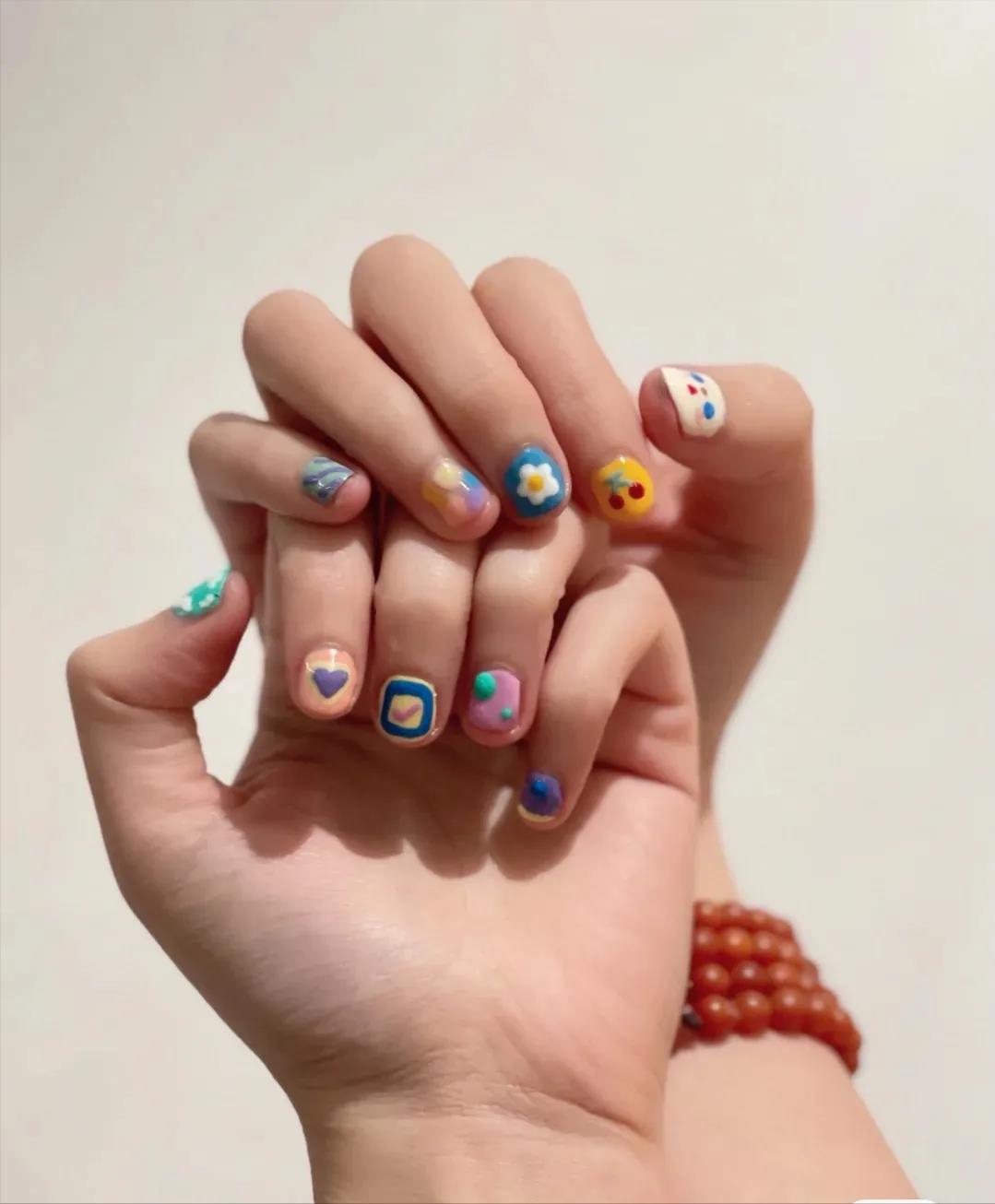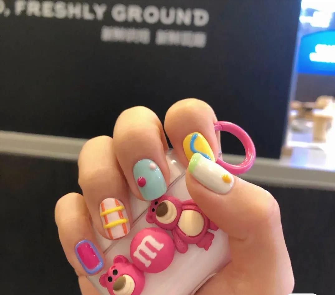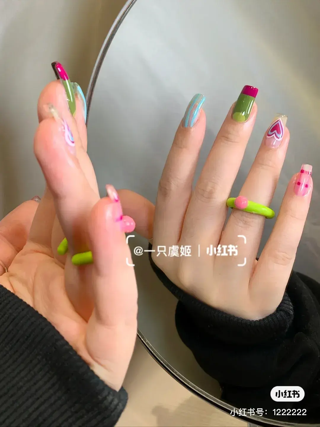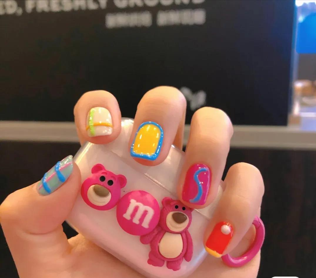 泰式美甲的精髓首先在于跳色,几乎每个手指的颜色都不一样,看着花里胡哨又土味,但就是这样的五彩斑斓才让它与众不同呀~