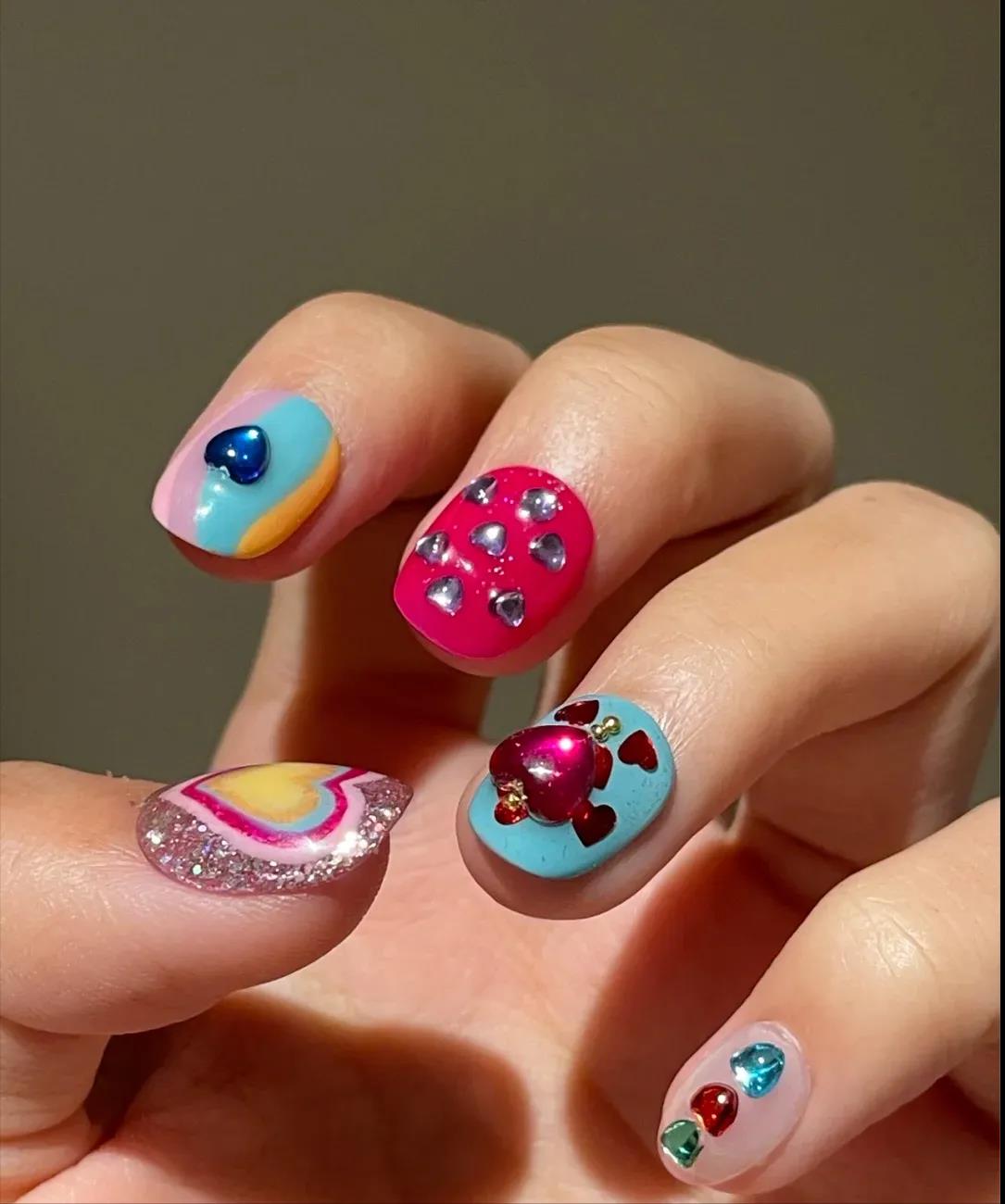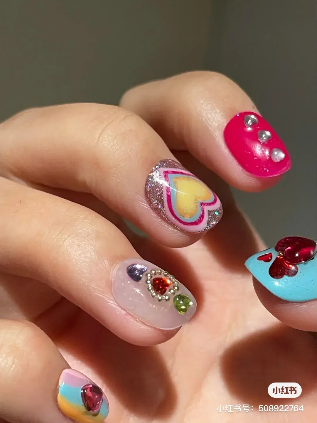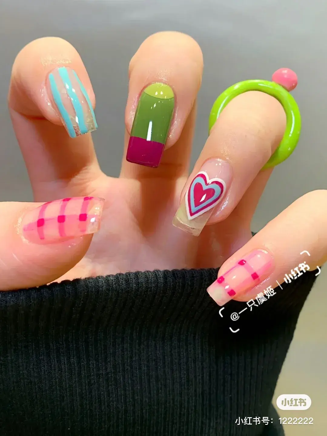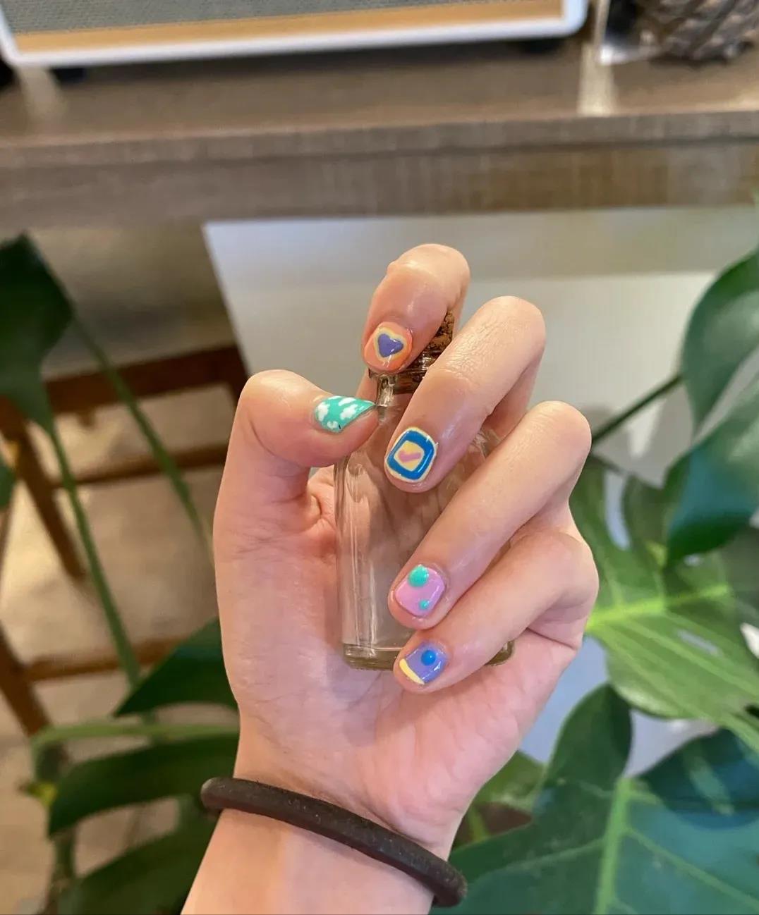 泰式美甲的精髓首先在于跳色,几乎每个手指的颜色都不一样,看着花里胡哨又土味,但就是这样的五彩斑斓才让它与众不同呀~