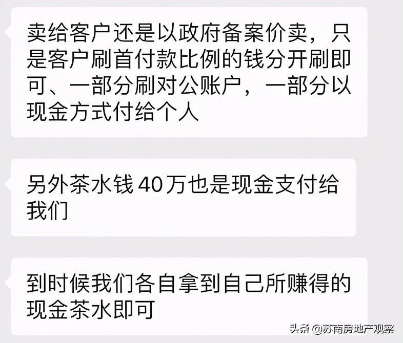 客户刷首付款比例的钱要分开刷,一部分刷给开发商对公账户,一部分以现金方式给个人,另外茶水费也是现金支付给到职业中介手里。
