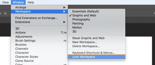 使用新增的锁定工作区选项,可防止意外移动工作区面板,尤其是对于在平板电脑/触笔上使用 Photoshop 时的情况。要访问此选项,请选择窗口 > 工作区 > 锁定工作区。