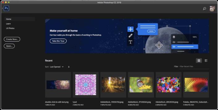 开始快速使用 Photoshop 主屏幕。您随时都能访问主屏幕,以此来查找有关新功能的信息、获取学习内容,以及轻松跳转至已打开的文档中。单击“选项”栏新增的主页图标,可随时访问主屏幕。