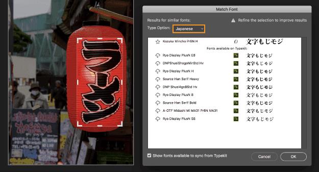 您现在可以使用“匹配字体”来搜索日语字体。“匹配字体”采用 Adobe Sensei 技术,允许您检测包含在图像选定区域中的文本,并将其与计算机或 Adobe Fonts 中已获许可的字体进行匹配,从而为您提供类似字体的建议。