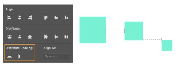 (左图)Photoshop 中的分布间距选项。(右图)对象之间水平分布的间距。