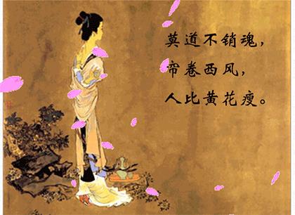 有一日,正值重阳节,李清照独自一个人饮酒从白天到黑夜,把酒赏菊,对丈夫的思念越饮越浓, 于是有感写了《醉花阴》,其中:“莫道不消魂,帘卷西风,人比黄花瘦。”表达了凄凉的西风吹处,卷帘飞起,帘内的思妇久久凝望着黄花,心在丈夫身上的佳人,因思夫之愁更比黄花瘦。李清照也把此诗寄给赵明诚,看过此诗赵明诚非常感动,更是对妻子的才华钦佩不已。