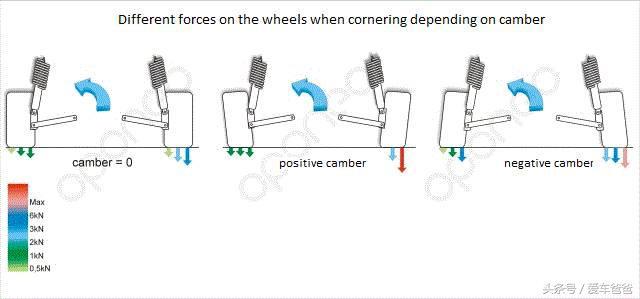 图上分别是不同倾角在转弯时的轮胎受力情况分析,可见负倾角轮胎的受力角度和接触面积都最理想。