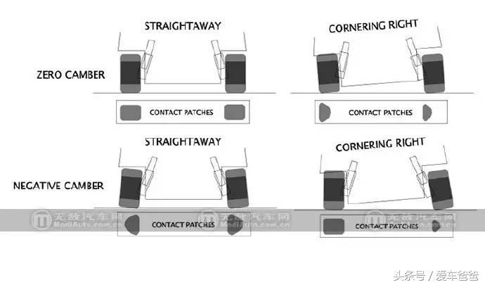 图:负倾角虽然提升过弯的轮胎抓地面积,但直线行驶时抓地面积会减少,刹车更容易抱死。