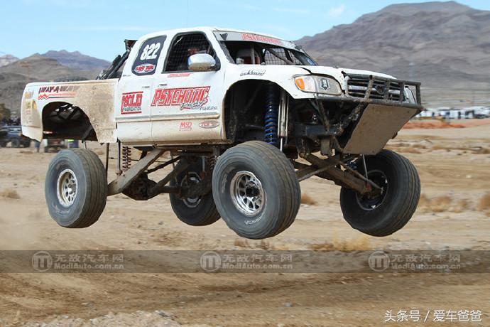 图:因为越野车在起伏相当大的路面运动,为了防止大行程时倾角变化过大,因此使用非常长的摇臂,图中的就是使用了俗称剪刀臂的悬挂设计。