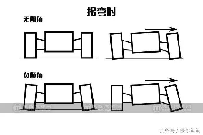 由于转弯时,车身会发生倾侧,外侧的车轮和悬挂都被压缩,内侧的悬挂和轮胎都伸张。这时候,原来0度倾角的车轮就会发生侧偏成正倾角。外侧车轮产生正倾角之后,轮胎的有效抓地面积减少,而且正倾角并不能有一个有效的分力用于辅助悬挂支撑车体,车身倾侧会增加,轮胎变形加剧,弯中操控能力减弱。同时,因为轮胎向车身外倾,陀螺效应会导致其发生向行驶方向外侧偏离方向的趋势。因此要解决这个问题,就要对车轮设定负倾角。在弯中时,倾角的变化会抵消原来所设定的负倾角而变成0度,从而补偿了抓地力减弱的问题,在弯道中抓地力会增加。因此,在赛车上会看到比街道用车更夸张的倾角,来提升弯道的性能。(赛车上设定倾角还可以延缓赛车轮胎过热,因为过弯时负载较大的外侧车轮如果带倾角时,车轮内外侧的摩擦力不一样,发热也不一样。如果能有平均的接地面积,就不会发生局部高温衰退的负面影响,轮胎也能更长的保持最佳性能)。