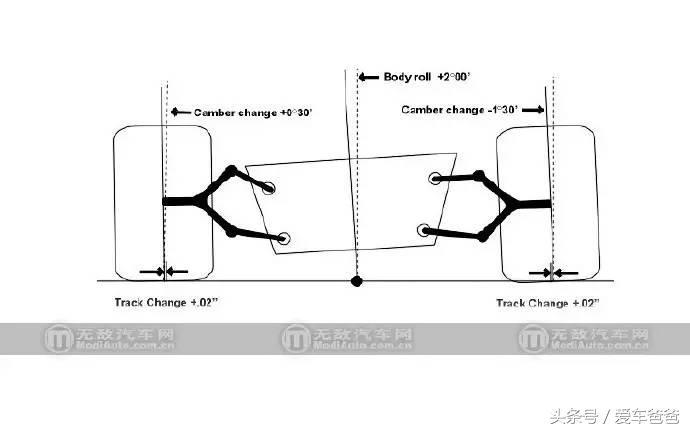 图:因为悬挂均是非平行四边形设计,因此悬挂摆动时会产生倾角,这就是倾角增益Camber Gain。倾角增益的大小由悬挂设计决定。