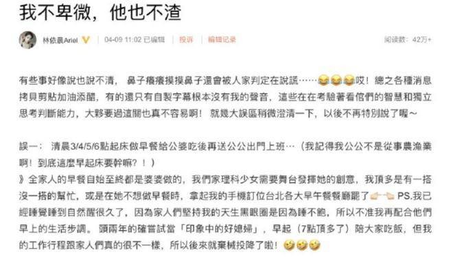 林依晨突然登上了热搜第一,原来是她发了一篇长文《我不卑微, 他也不渣》,就近日网络上热传的“七点起床照顾公婆、送公公上班”等内容进行澄清,主要回应了在她身上的六个重点争议,也得到好友力挺。