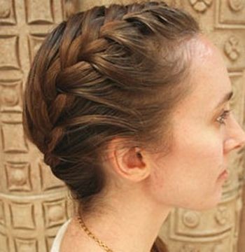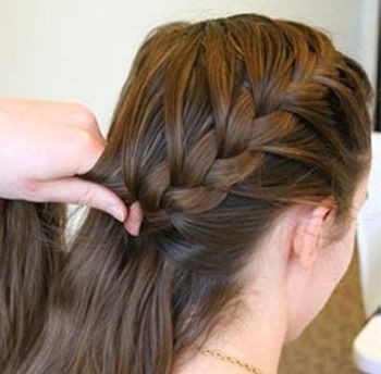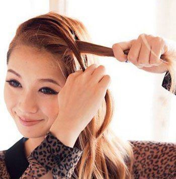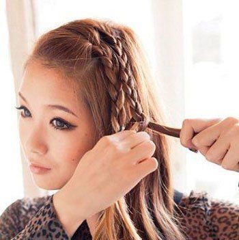 step1:侧分后选择发量较多的一侧,一缕头发分为三股,编起来。