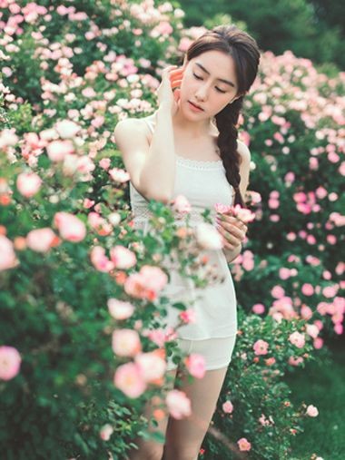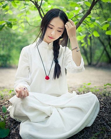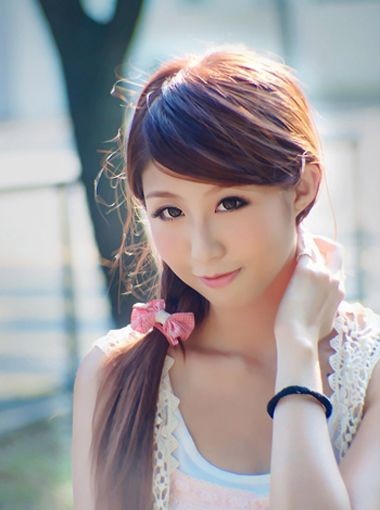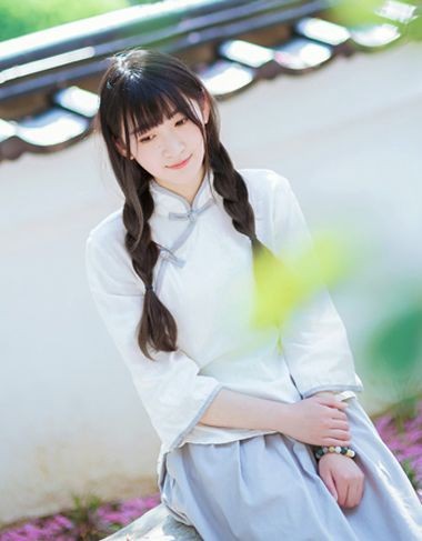 黑色的长头发更适合编中国风的编发发型,飘逸的头发发丝编不起来可以散下来,直接从肩头上拢往一边,编成紧一点的麻花辫放,发尾用小皮筋固定之后,再来打理分在额头两边的散发就好。