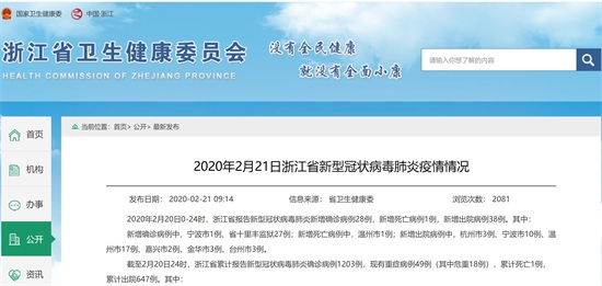 浙江省卫健委21日的通报则表示,2020年2月20日0-24时,浙江省报告新型冠状病毒肺炎新增确诊病例28例,新增死亡病例1例,新增出院病例38例。其中:新增确诊病例中,宁波市1例、省十里丰监狱27例;新增死亡病例中,温州市1例;新增出院病例中,杭州市3例、宁波市10例、温州市17例、嘉兴市2例、金华市3例、台州市3例。