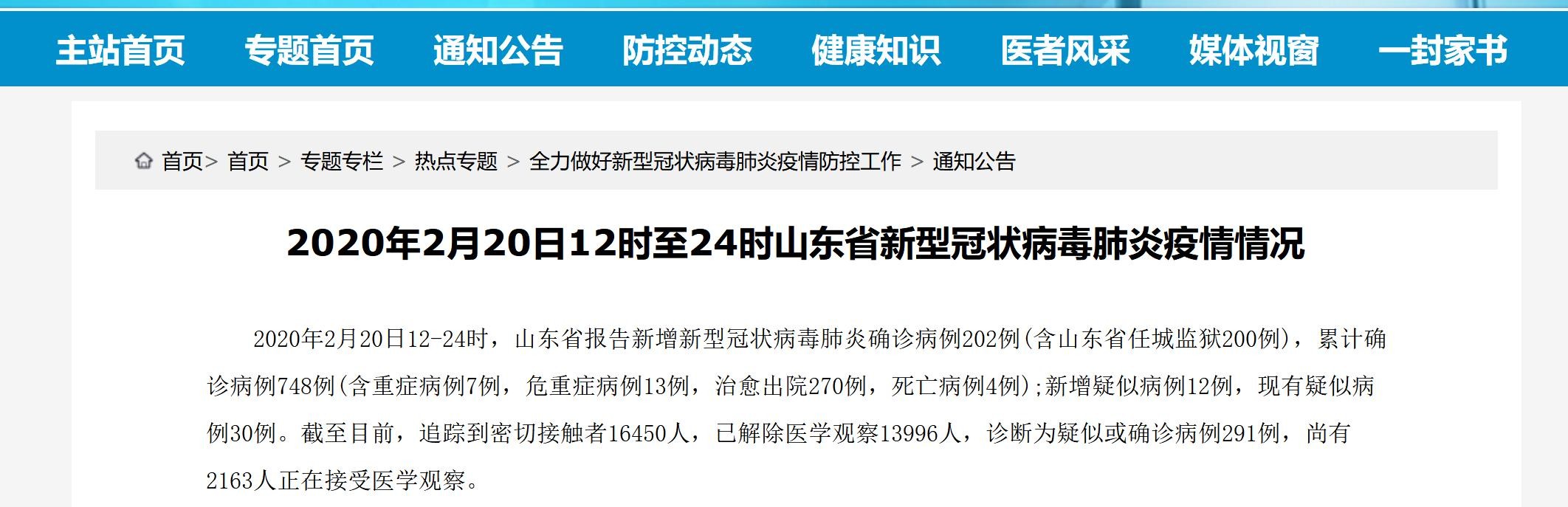 据山东省卫健委21日消息,2020年2月20日12-24时,山东省报告新增新型冠状病毒肺炎确诊病例202例(含山东省任城监狱200例),累计确诊病例748例(含重症病例7例,危重症病例13例,治愈出院270例,死亡病例4例)。