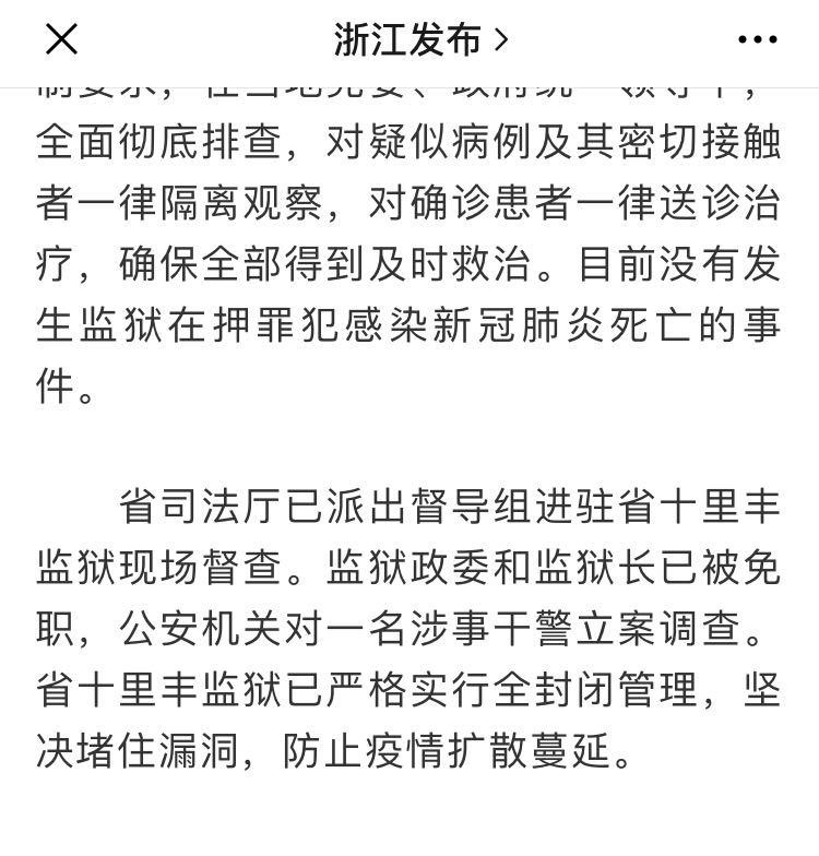 另据浙江省人民政府新闻办公室微信公号“浙江发布”21日消息,该省司法厅已派出督导组进驻省十里丰监狱现场督查。监狱政委和监狱长已被免职,公安机关对一名涉事干警立案调查。省十里丰监狱已严格实行全封闭管理,坚决堵住漏洞,防止疫情扩散蔓延。