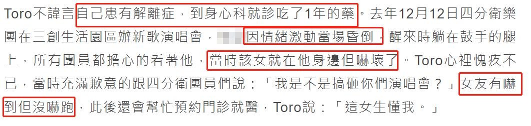 郭苇昀还大方承认自己患有解离症,已经看病吃药一年。去年参加某乐团演唱会时,他因情绪激动当场昏倒,醒来时躺在鼓手的腿上,大家都很担心他,女友则被吓坏了,幸好女友没有被吓跑。