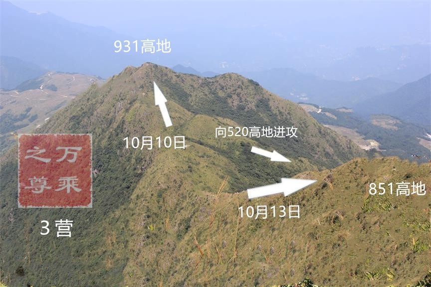 亚当斯上校先让1营在851高地北面,法国营向931高地的南面同时发起佯攻,第2营在没有炮火准备的情况下摸近了931高地,10月6日凌晨3时931高地已经被第23团包围了,到中午931高地落入第23团之手,10月10日,2营G连只剩下23人,替补新兵于当天送到G连,G连现在有了60人,指挥G连的瑞德尔中尉收到命令,离开951高地,顺着陡峭山脊向520高地进攻,F连紧跟在G连后面,E连在南面500码外与此平行的一段山脊上提供火力支援。520高地平坦的顶峰距离G连的出发点只有大约200码,到16时,美军占领了520高地。在战斗中G连大约有30人伤亡,G连占领520高地后,美军完全包围了851高地,1营和法国营一步一步地从南面攻击,艰苦战斗到10月13日黎明时分,法国营先踏上了851高地主峰。