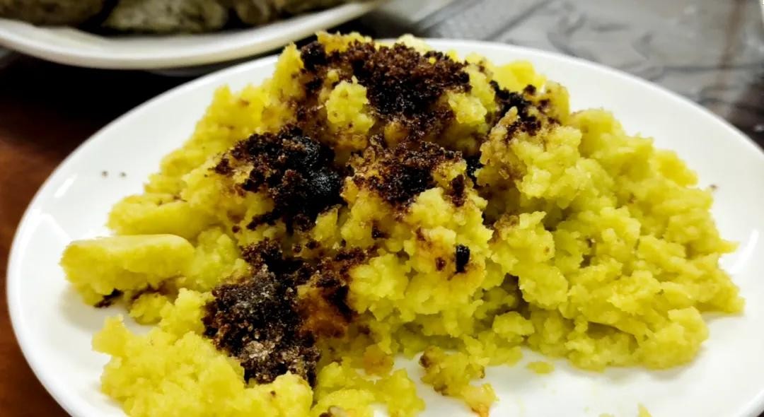 油搅团,撒拉宴的一道经典特色菜,用菜籽油、面粉和水先煮再炒,最后撒上红糖。