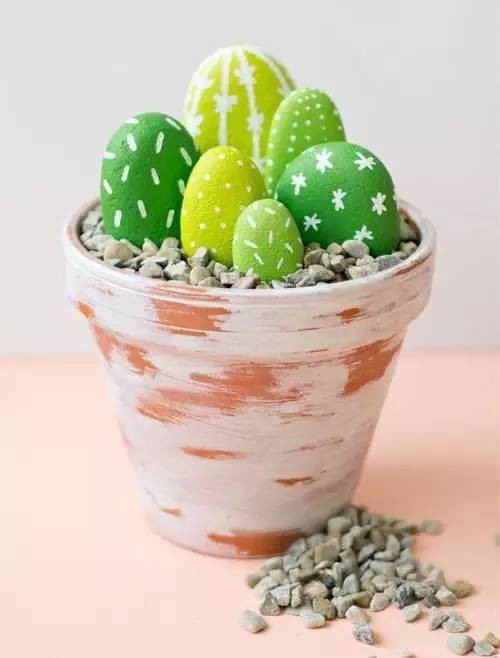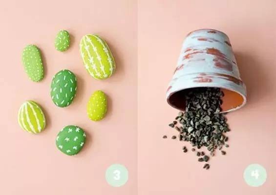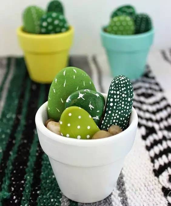 椭圆形的石头,大大小小错落有致的摆在花盆里,刷上绿色的丙烯颜料,而后点些小点点,像不像仙人掌,绝对不差!而且这个仙人掌真是很难会死掉了。