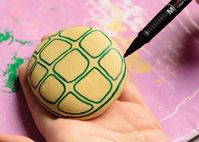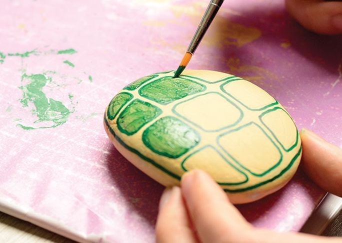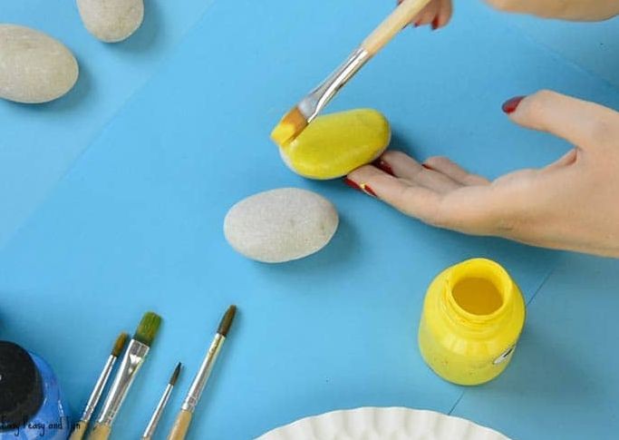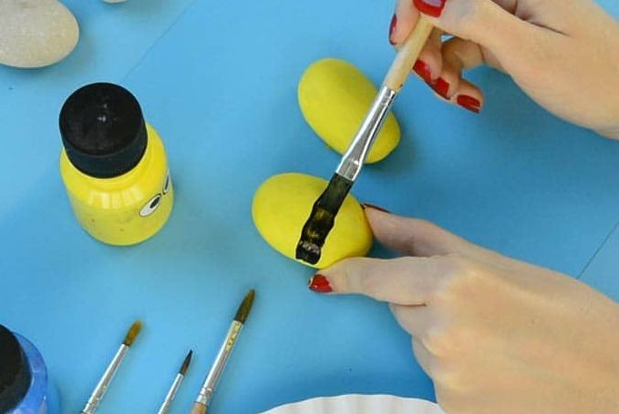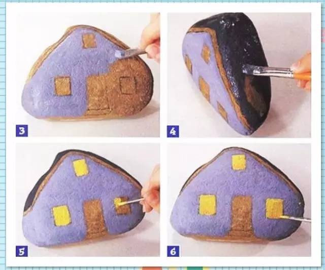 制作步骤:把石头清洗干净,用颜料涂成通体黄色,让颜料完全干燥。