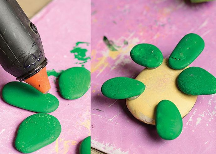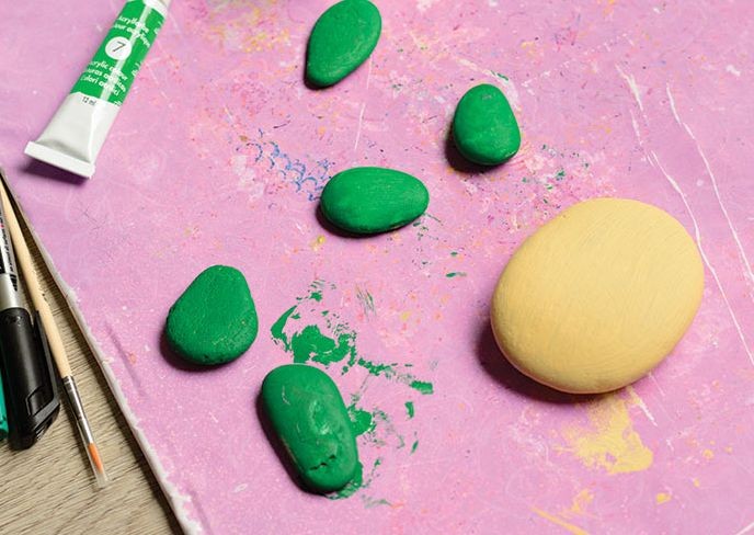 把5块小石头染成绿色,备用。制作过程中,可以在下面垫一张纸,防止弄脏桌面哦!