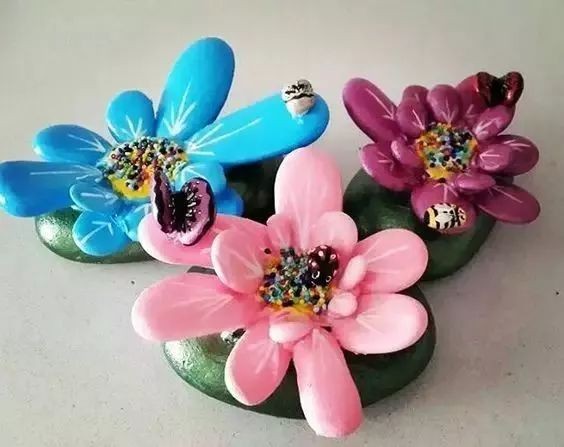 把石头涂上颜色,在拼接起来,也是一朵朵好看的花朵呢。