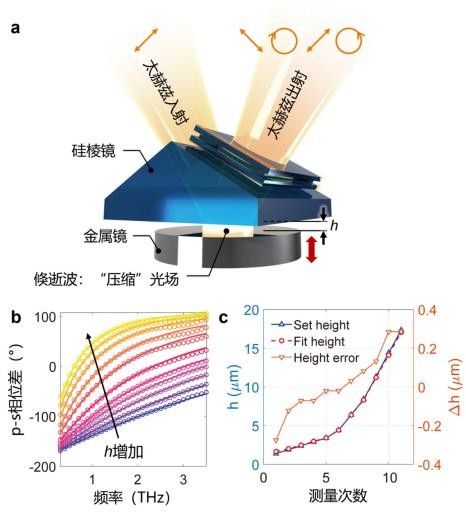▲通过金属镜微纳高度移动实现的偏振态改变。(a)金属镜调控全反射的方法示意图;(b)不同金属镜高度h下的p-s相位差变化;(c)金属镜高度的微纳控制。