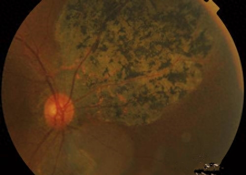如果到医院进行专业的眼底检查,我们可观察到患者视盘呈蜡黄色,视网膜血管变细,旁边出现青灰色色素沉着,晶状体后囊下有锅底样浑浊,已经严重影响患者视力情况。