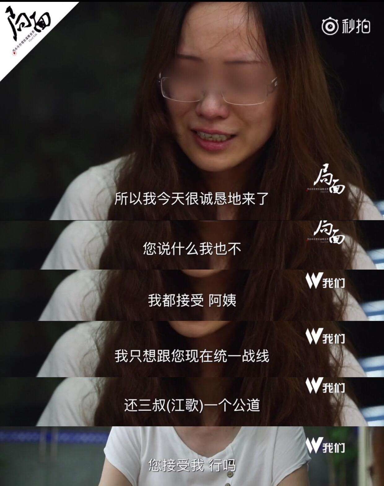 首先,她在见到江母时表现得非常愧疚,非常软弱,“阿姨我们一家都做错了”“阿姨你别哭了你打我骂我吧”“我今天就是来认错了你说什么我都不会反驳”。